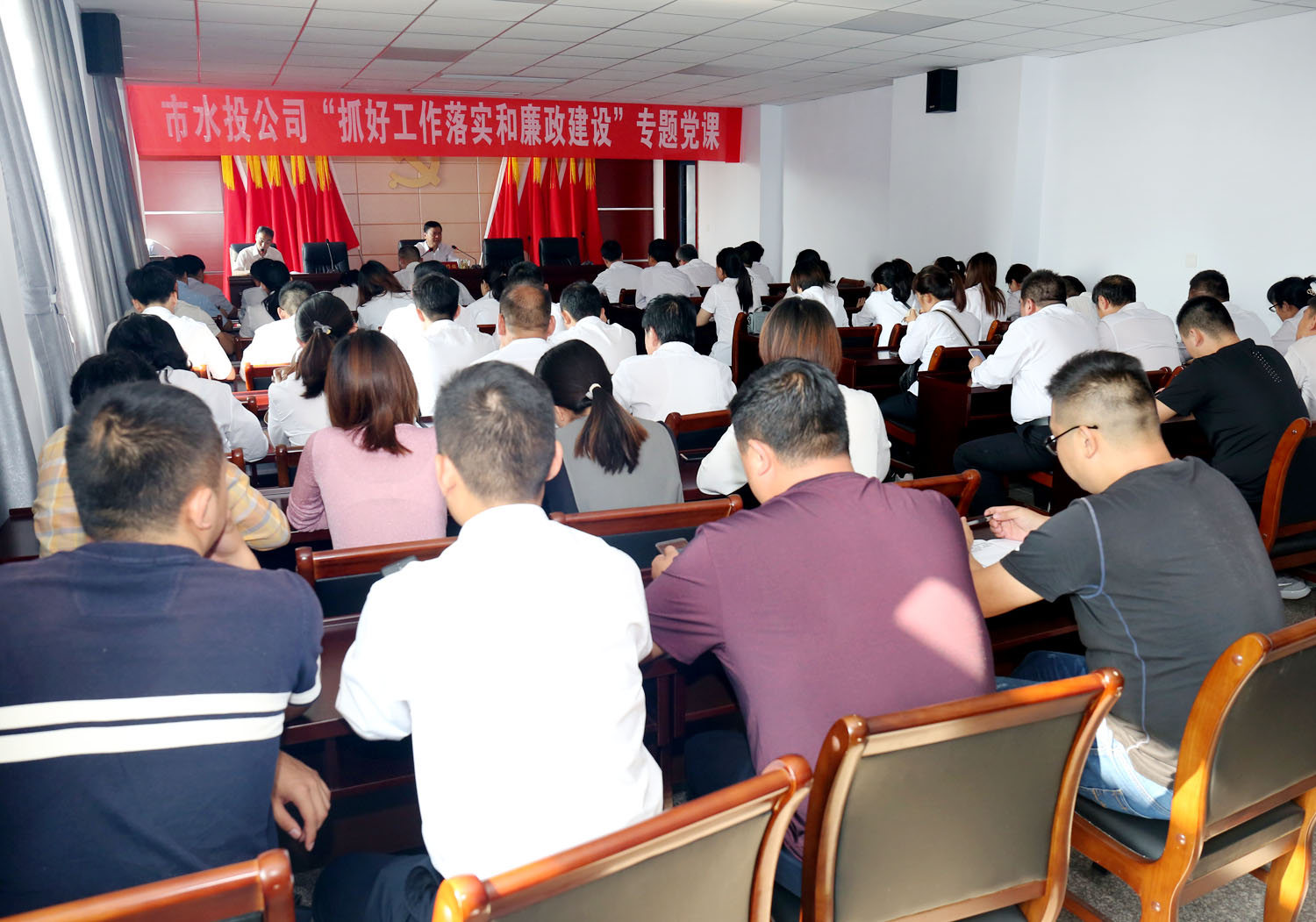 為深入推進(jìn)“不忘初心、牢記使命”主題教育活動(dòng)開展,按照市委統(tǒng)一部署安排,經(jīng)公司黨委研究決定,于9月29日下午在公司六樓會(huì)議室,黨委書記崔作銘為公司全體黨員講了一堂題為“抓好工作落實(shí)和廉政建設(shè)”的專題黨課。公司各黨(總)支部全體黨員到場(chǎng)聽講。