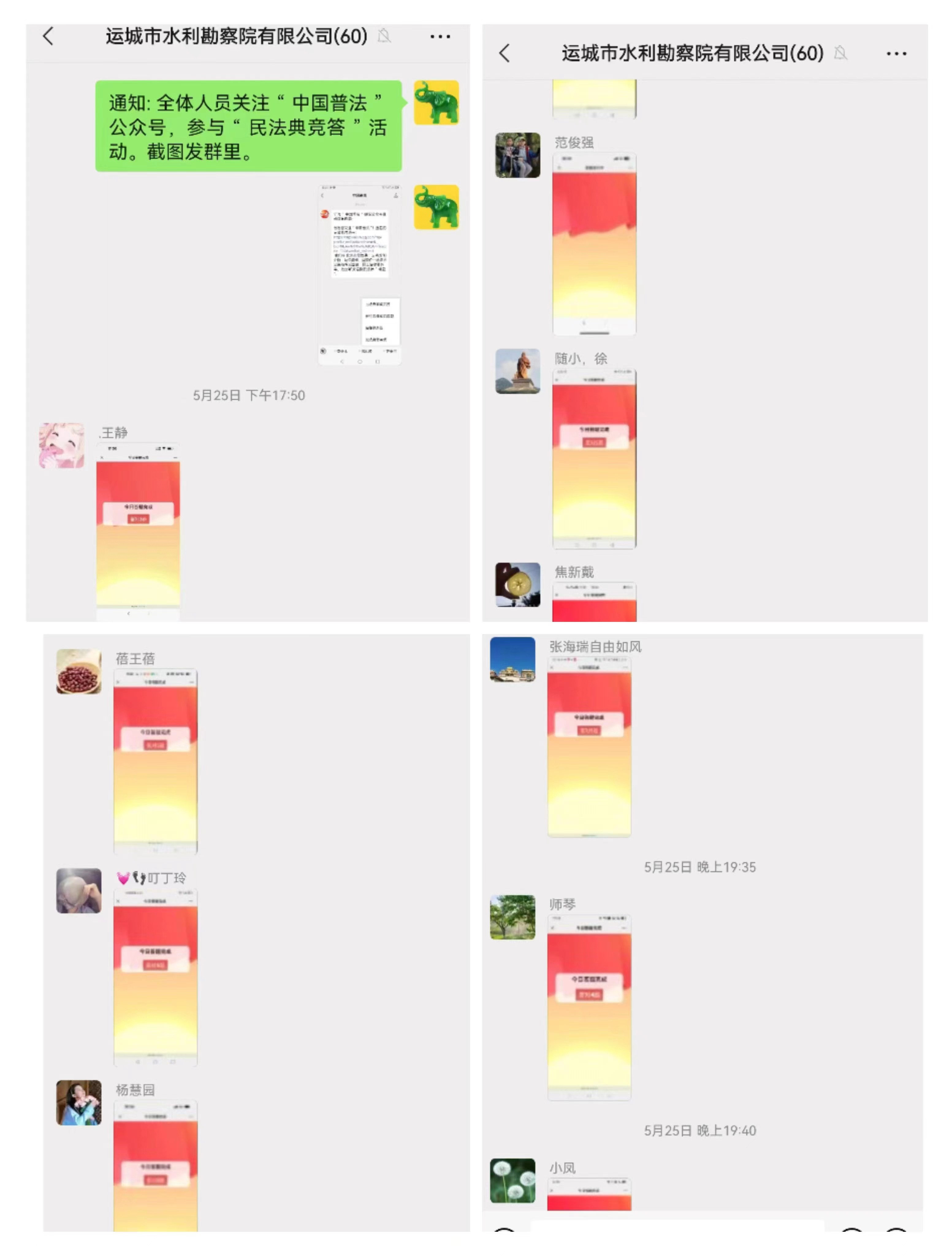 5月26日,公司組織全體干部職工參與《民法典》知識(shí)競(jìng)答活動(dòng),活動(dòng)以線上答題形式展開(kāi),通過(guò)關(guān)注并登錄“中國(guó)普法”微信公眾號(hào),在“齊參與”欄目中進(jìn)行。職工們積極踴躍,迅速掀起了答題熱潮,堅(jiān)持每日答題,在公司形成了學(xué)習(xí)法典、運(yùn)用法典、崇尚法典的良好氛圍。此次活動(dòng)的開(kāi)展,讓全體干部職工切實(shí)意識(shí)到民法典在工作生活中保護(hù)自身合法權(quán)益方面的重要作用,進(jìn)一步提高了干部職工的學(xué)法氛圍和法治意識(shí),為建設(shè)團(tuán)結(jié)和諧、文明進(jìn)步的大美運(yùn)城提供了堅(jiān)強(qiáng)的法治保障。