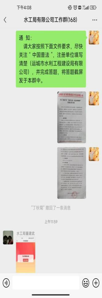 為加大《民法典》宣傳,努力讓每一名干部職工走進(jìn)民法典、了解民法典、運(yùn)用民法典,切實(shí)增強(qiáng)廣大干部職工的法治意識(shí)和法治信仰,5月29日運(yùn)城市水利工程建設(shè)局有限公司組織干部職工開(kāi)展2023年“美好生活•民法典相伴”主題活動(dòng)?;顒?dòng)現(xiàn)場(chǎng)傳達(dá)了運(yùn)城市水務(wù)投資建設(shè)開(kāi)發(fā)有限公司《關(guān)于2023年“美好生活•民法典相伴”主題宣傳方案》,并向大家介紹了民法典的重要意義。活動(dòng)中干部職工積極關(guān)注“中國(guó)普法”,注冊(cè)賬號(hào)并進(jìn)行了答題。此次活動(dòng)激發(fā)干部職工主動(dòng)學(xué)習(xí)法律知識(shí),增強(qiáng)了用法治思維和法治方式解決問(wèn)題的能力。