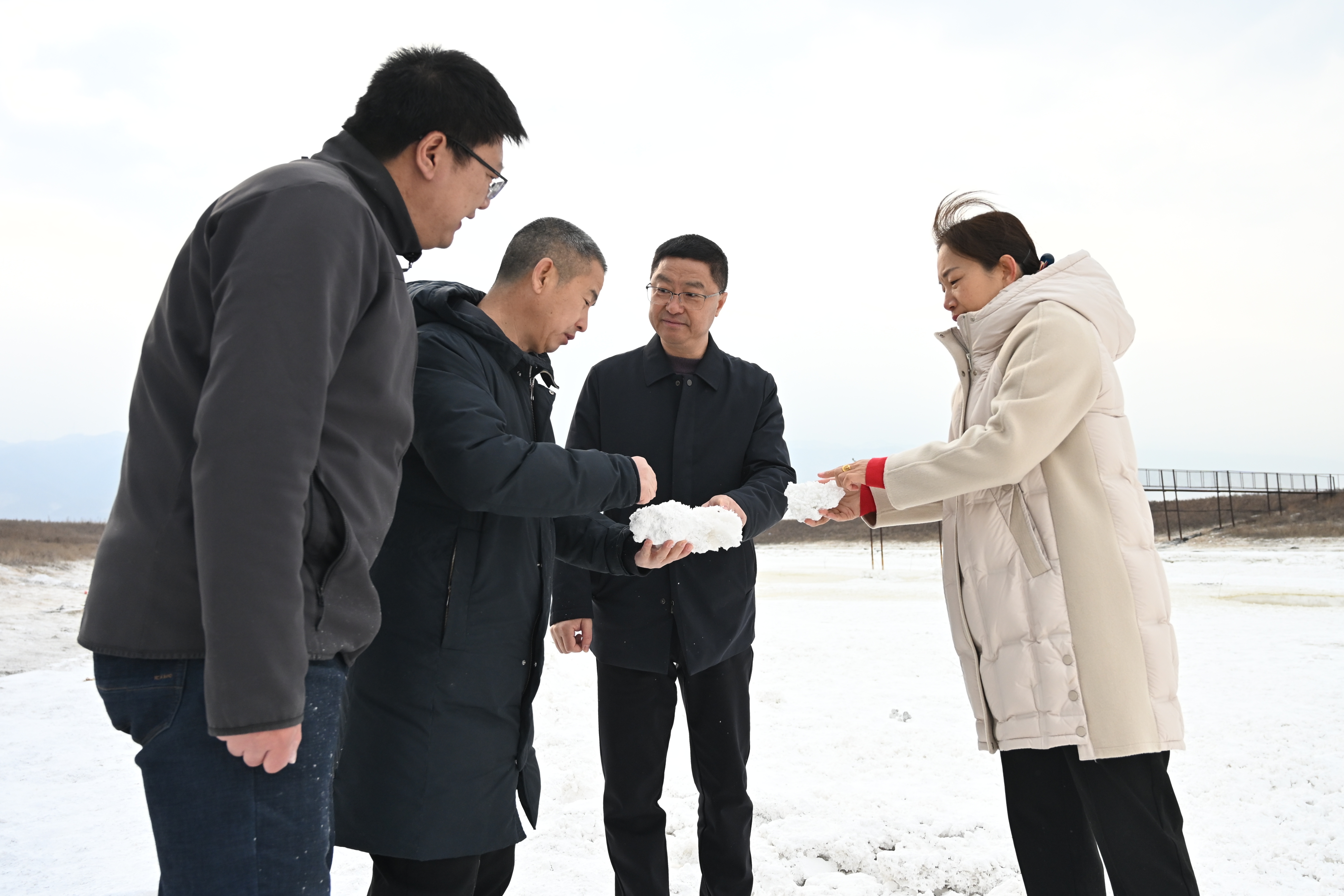在一期項目的木棧道上,董事長薛文兵指出,木棧道貼近鹽湖之水,必須完善好相應(yīng)的細(xì)節(jié),在充分考慮到游客安全的情況下,科學(xué)布局一些配套設(shè)施,持續(xù)增加游客對木棧道的體驗感。他同時指出,“硝花”毗鄰木棧道,是鹽湖冬季的獨(dú)特景觀,要積極優(yōu)化小火車線路,方便游客觀賞。