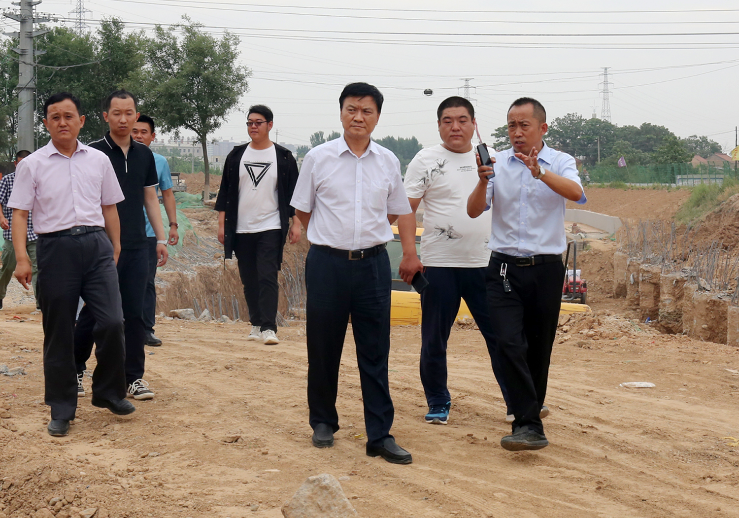 在施工現(xiàn)場,崔作銘董事長現(xiàn)場聽取了項(xiàng)目部負(fù)責(zé)人對工程中存在問題和建設(shè)進(jìn)度的匯報(bào)。查看了建華廠和左岸凰城段施工現(xiàn)場。針對施工中存在的無施工便道和進(jìn)度慢的問題,他要求:一、建華廠段渠道施工,利用209國道護(hù)欄,將渠道和國道緊密結(jié)合,加快施工;二、左岸凰城段施工中無道路可行,以渠道做施工道路,輪替施工,橋梁施工加快速度,盡快實(shí)現(xiàn)通車;三、項(xiàng)目部要加班加點(diǎn),加快建設(shè),力爭6月底完成渠道主體工程。